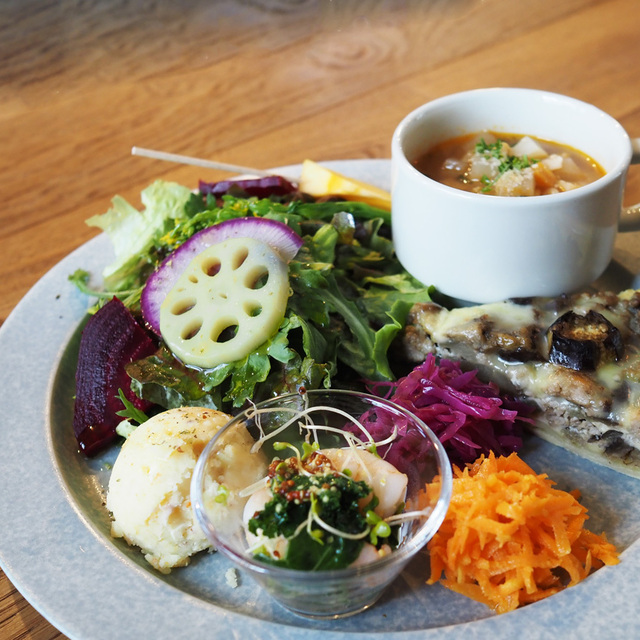 旬の野菜の数種の総菜とガパオライスが味わえます