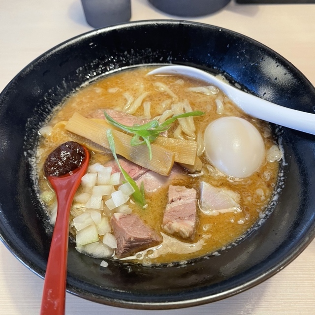 - 濃厚スープに腰のある太い麵がモチモチで美味しい